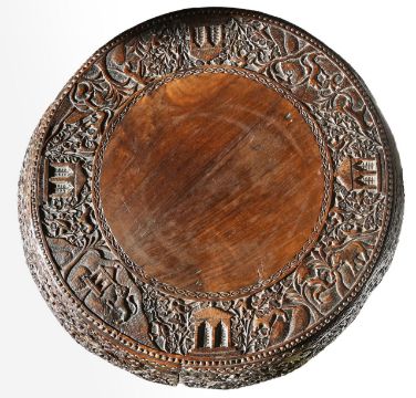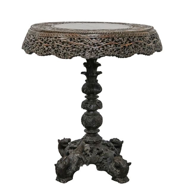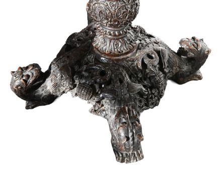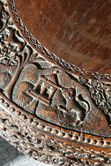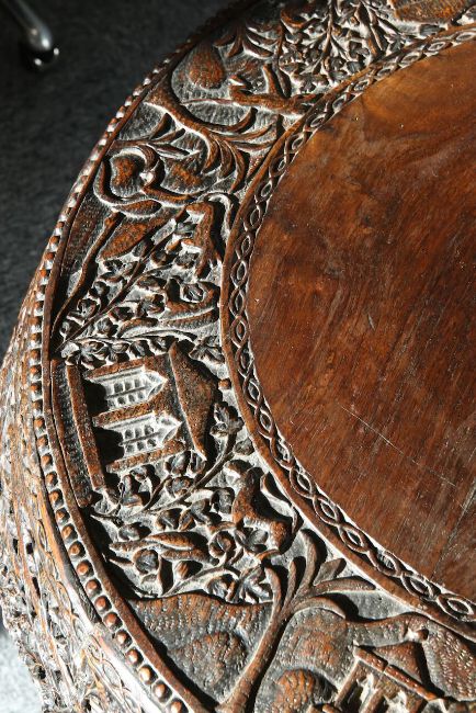 late 19th century, carved with animals and traditional houses, raised on a quatreform base, the feet modelled as mythical beasts