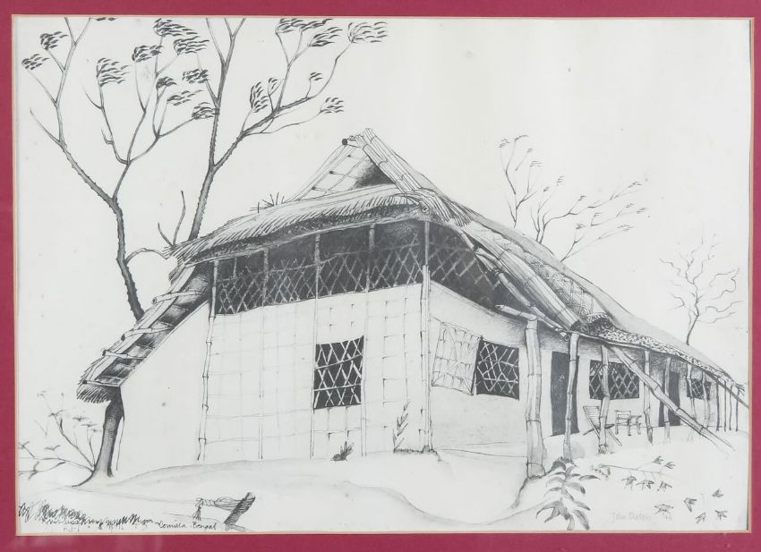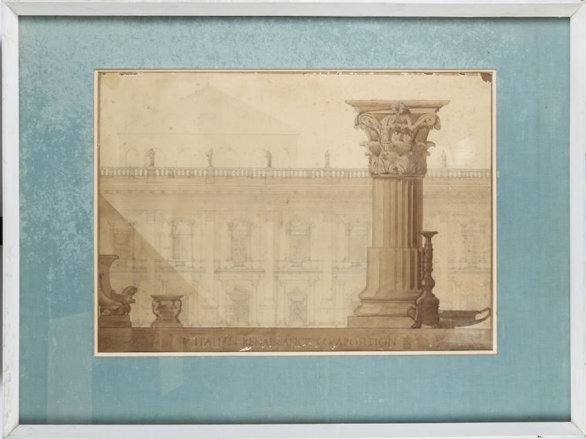 comprising 'An Architectural Composition...' student work of Corinthian column and stately home, inscribed, monotone watercolour and pencil, mounted, framed and glazed; with a printed sketch of an Indian thatched cottage, signed, framed and glazed (2)