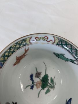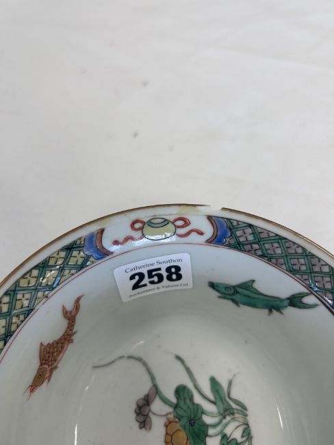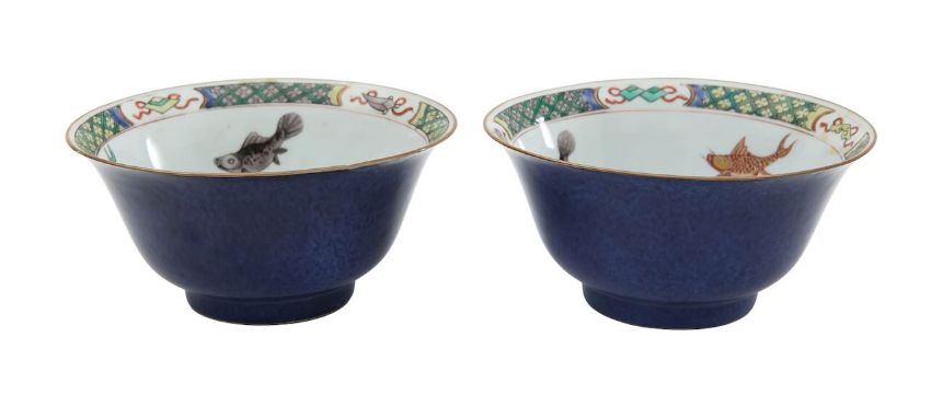 Kangxi period (1662-1722), the interior decorated in famille verte enamels with koi, to a border of precious objects, the exterior with a powder blue ground, square Kangxi mark to the base (4)