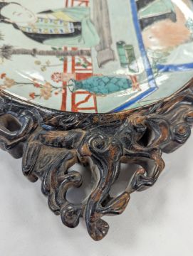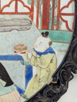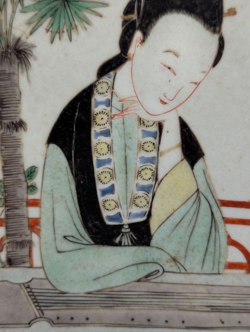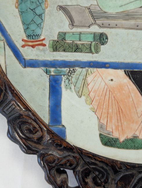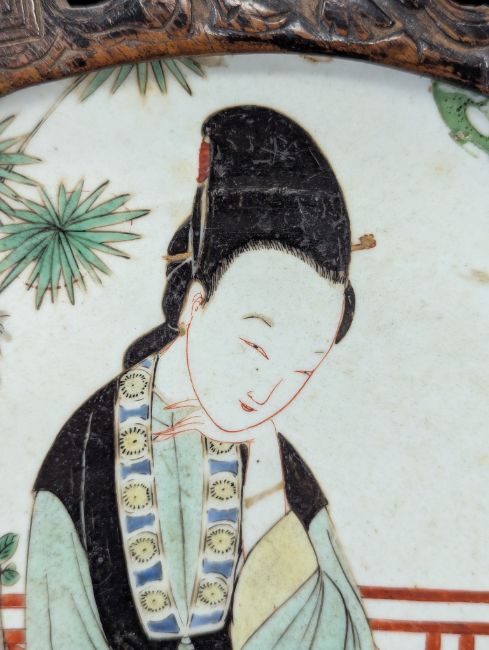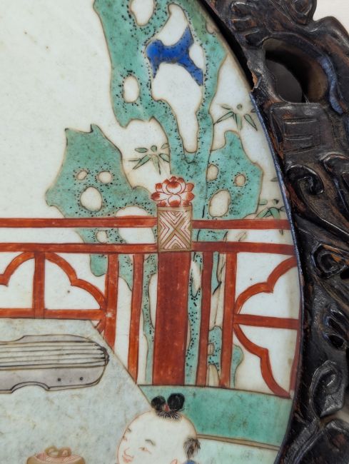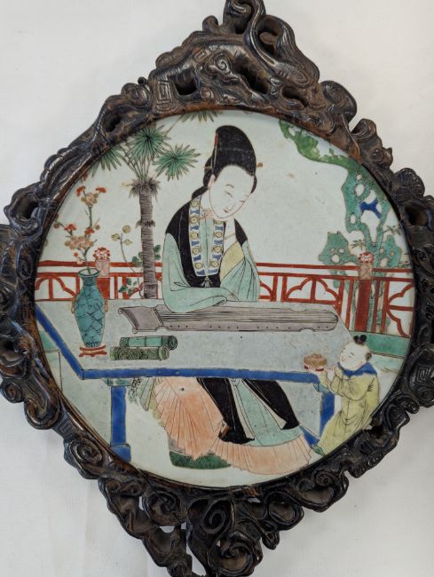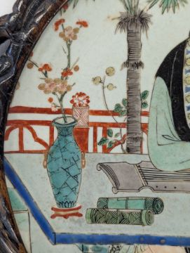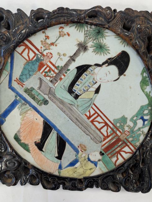 Kangxi period, (1662-1722), depicting an attendant and lady seated at a table, with a zither, scrolls and cracked ice vase, within a landscape, with a scholars rocks, and a bamboo palm, attendant, in a later carved wood frame