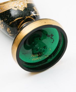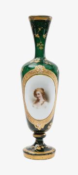 19th century, the a flared neck with gilt foliate decoration, leading to an urn form body, with an enamelled panel depicting a lady in 16th century dress, within a gilt border, the base inscribed 'Prima-Donna after Correggio'