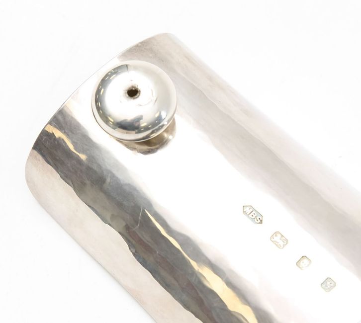 of tilted half-pipe form, reservoir to end, raised on single bun foot, slight planished finish